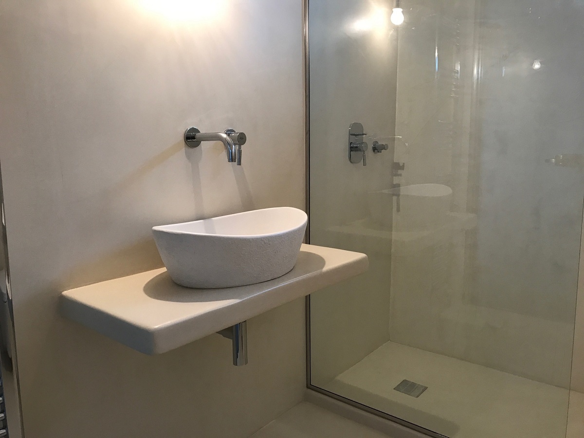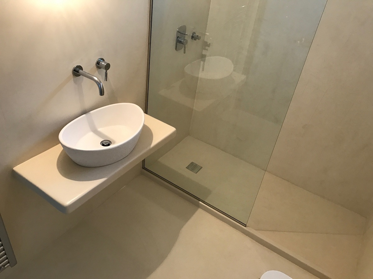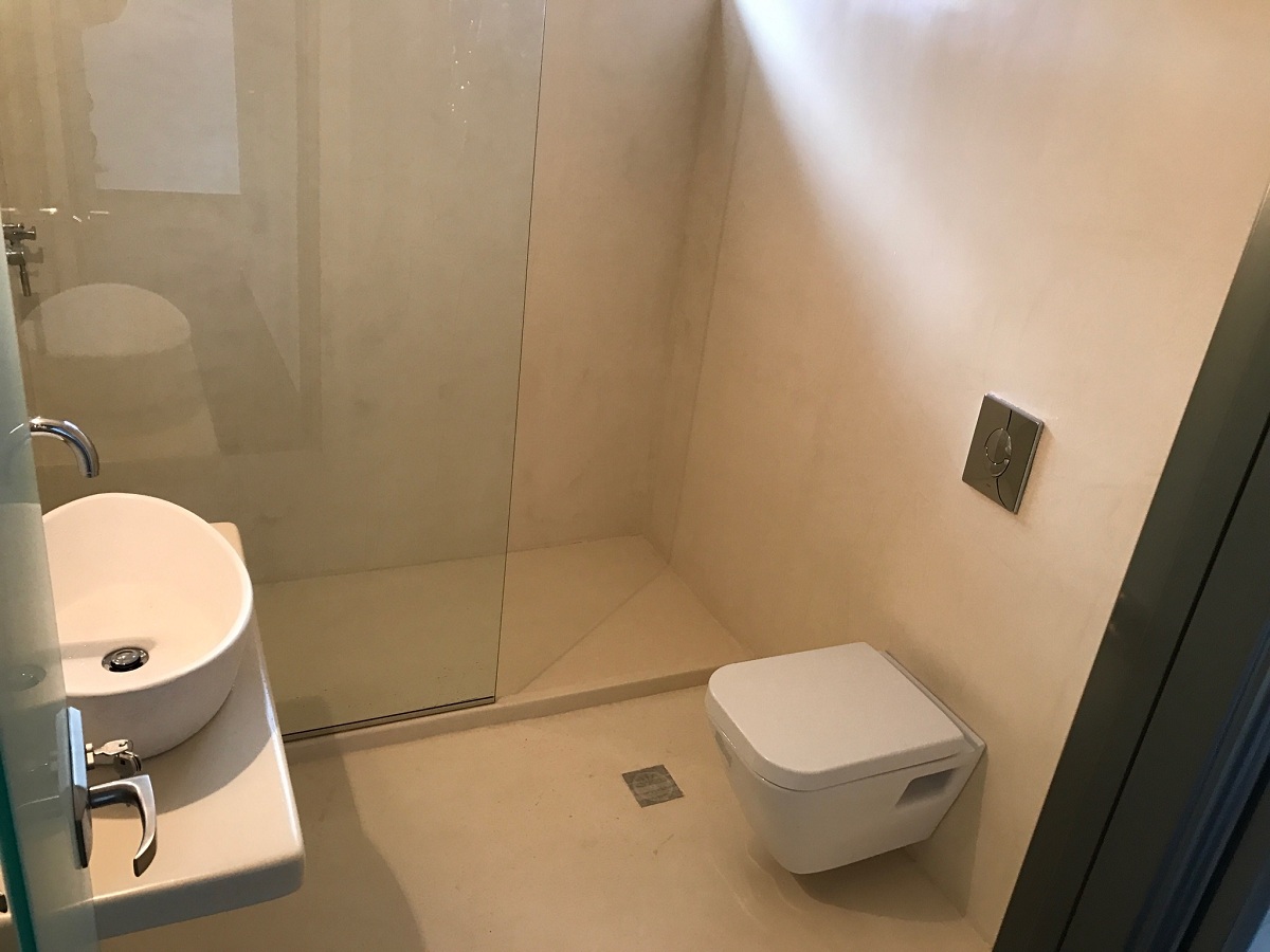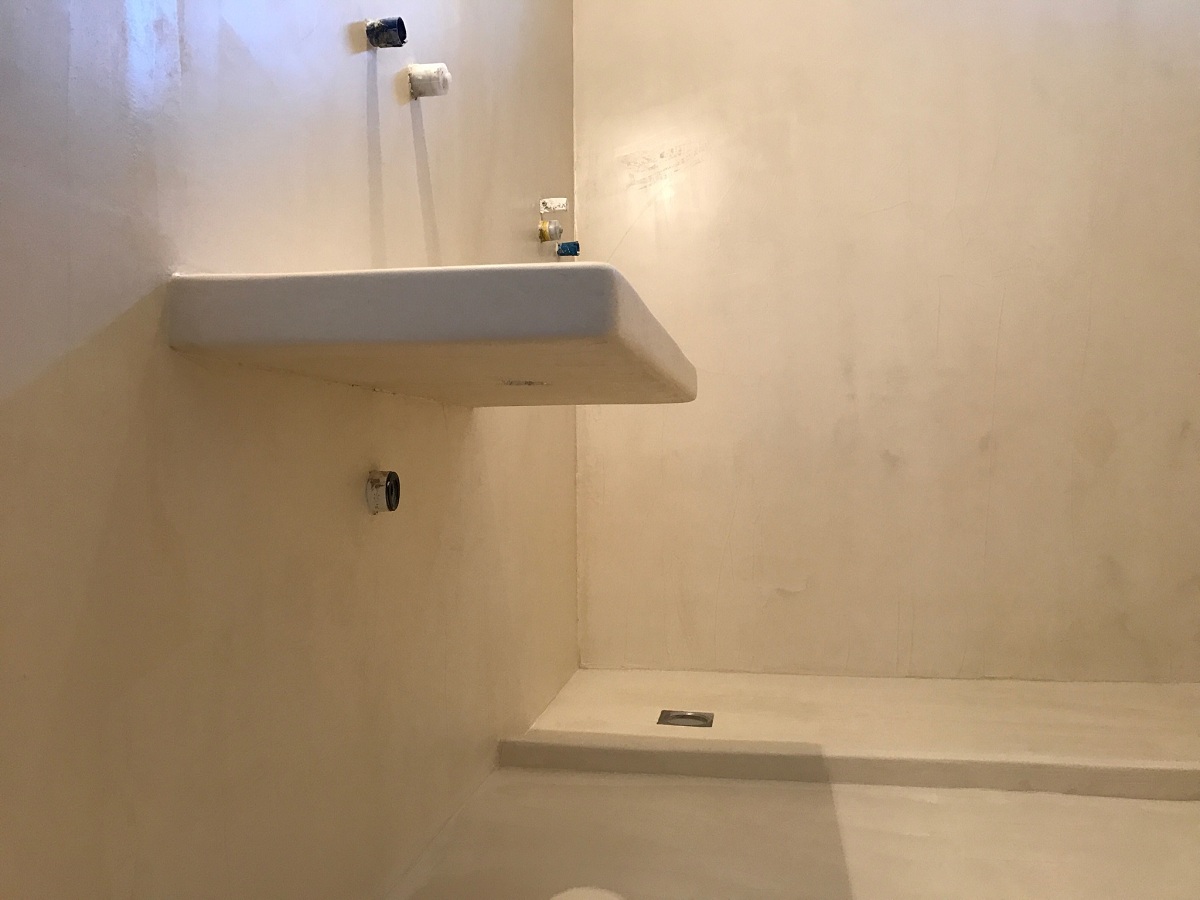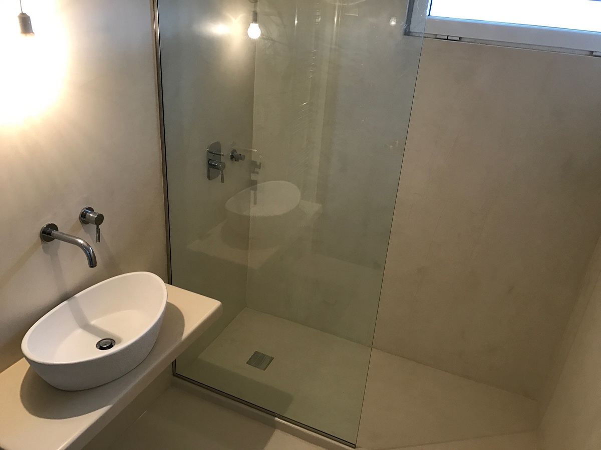 Ανακαίνιση μπάνιου με εφαρμογή πατητής τσιμεντοκονίας και κατασκευή χτιστού πάγκου σε οικία στα Γλυκά Νερά.