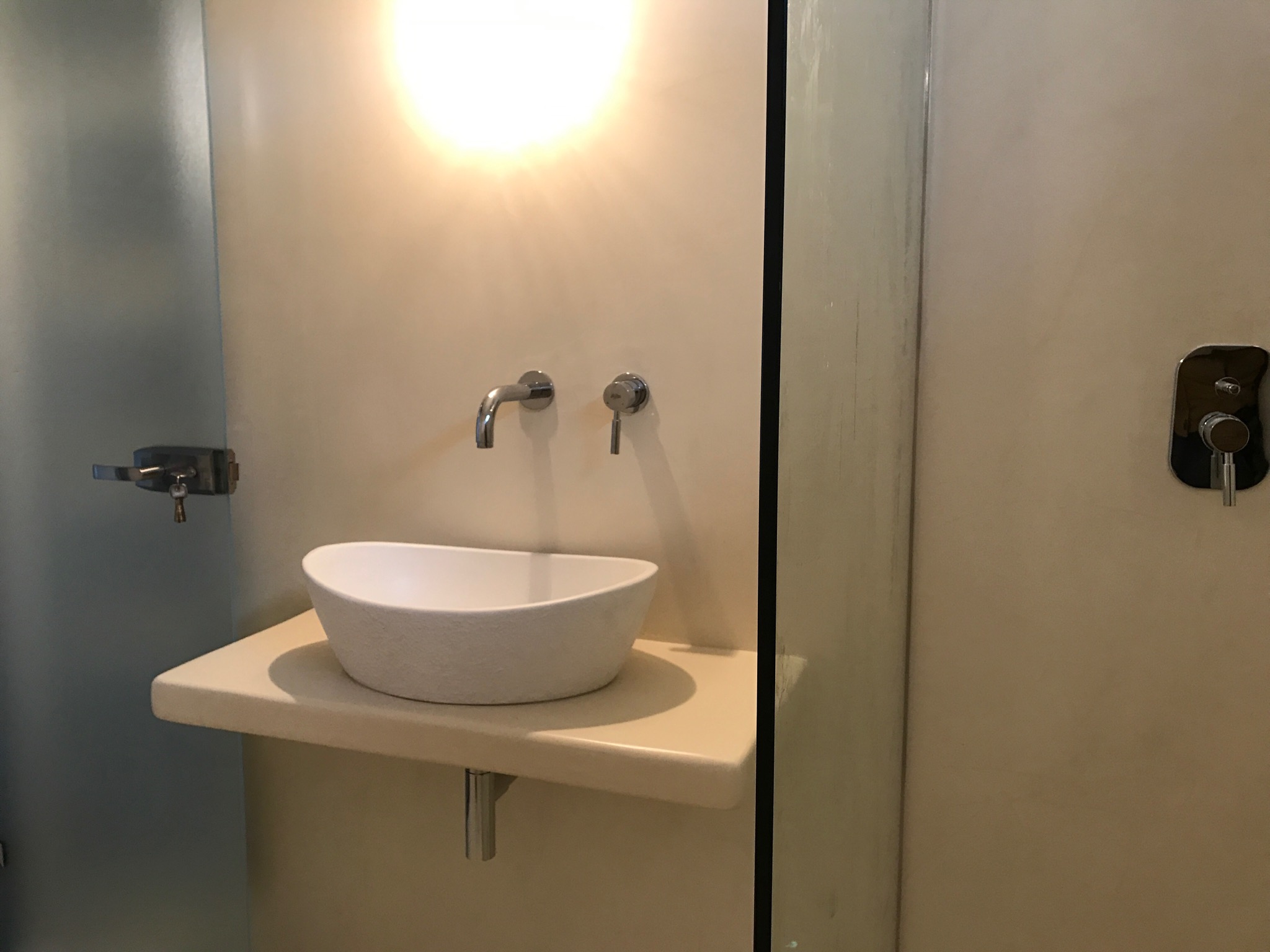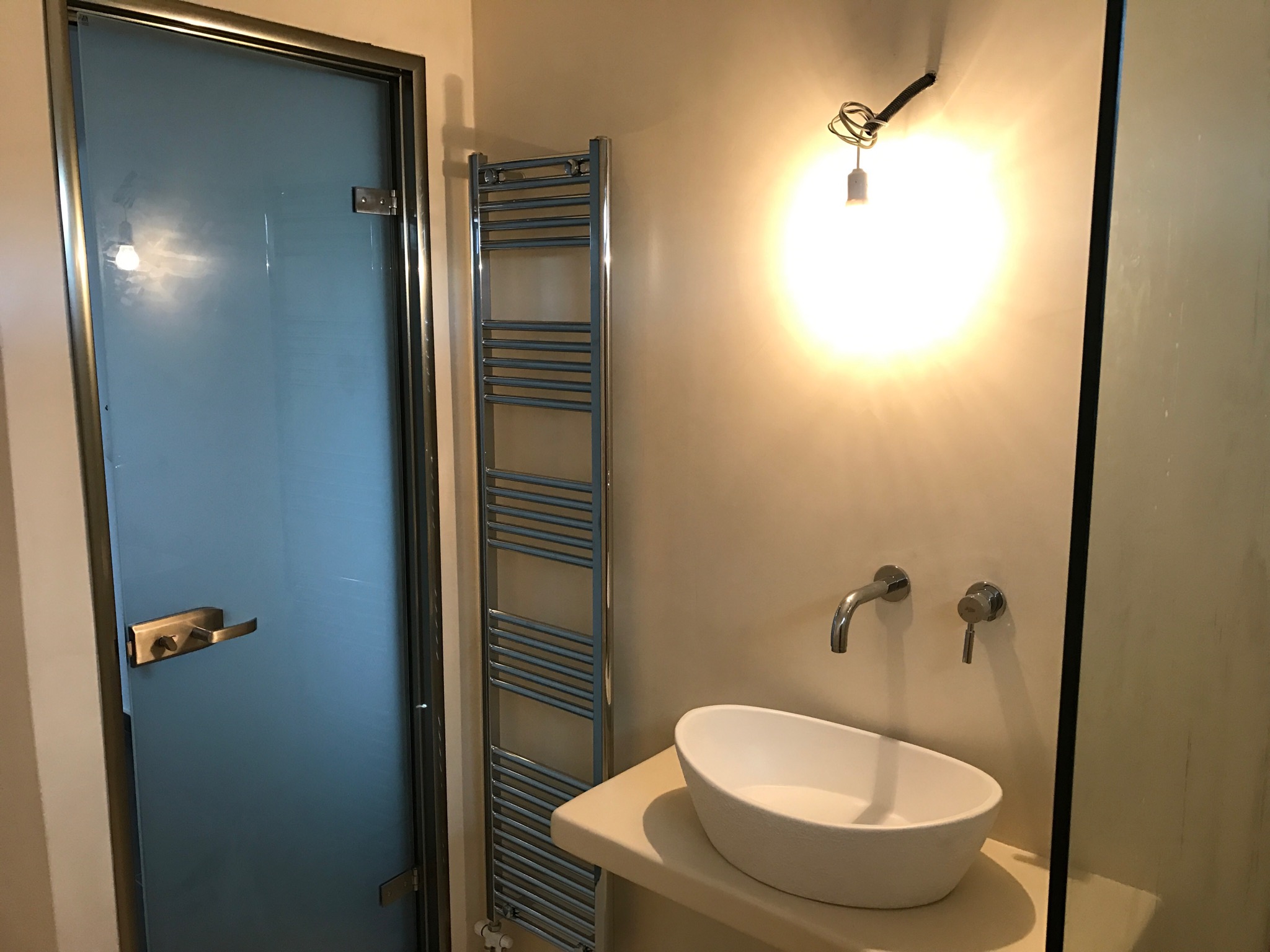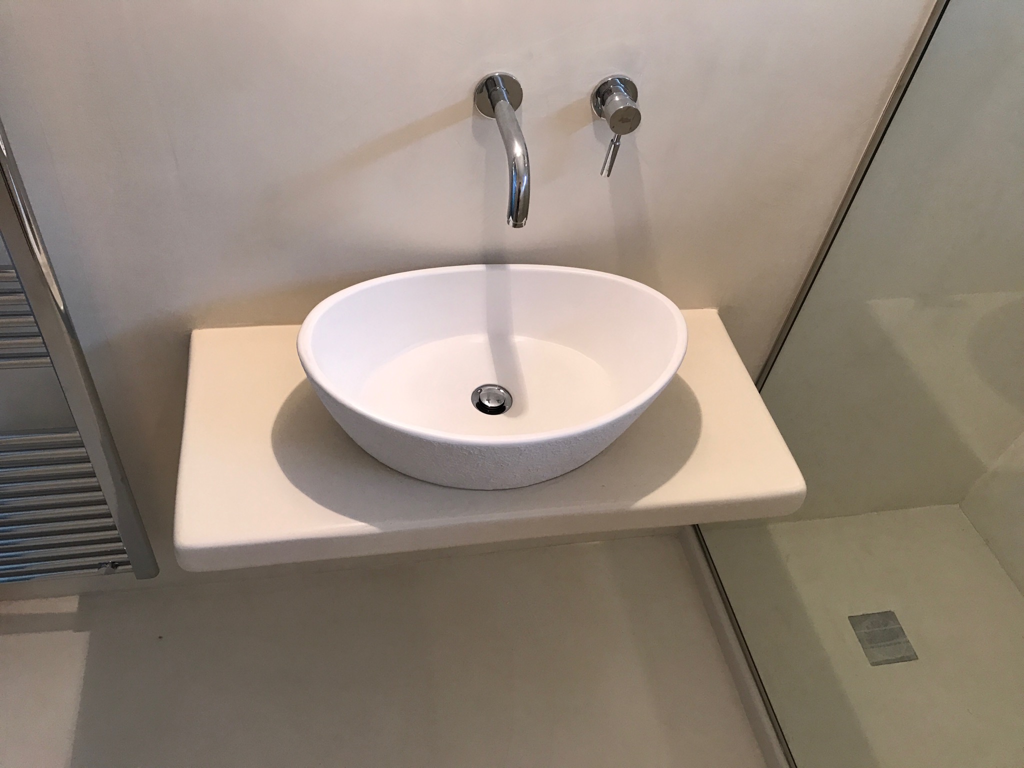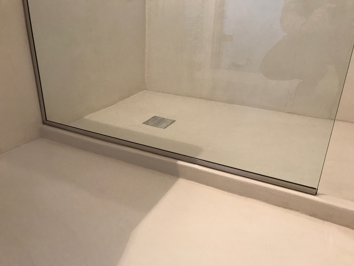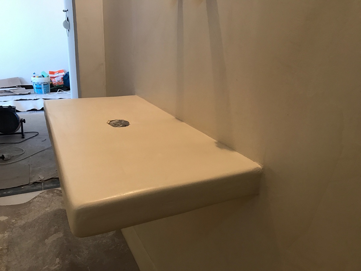 Ανακαίνιση μπάνιου με εφαρμογή πατητής τσιμεντοκονίας και κατασκευή χτιστού πάγκου σε οικία στα Γλυκά Νερά.